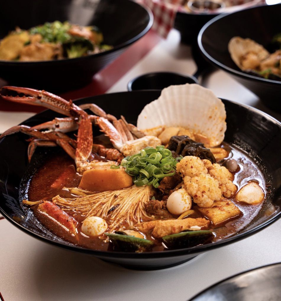 Make your choice between the numbing spice of our signature Malatang broth or the tangy zest of Tom Yum soup, and watch as your dish is expertly cooked to perfection. Beyond our striking red, black, and white interiors, the real magic happens around our tables - filled with laughter, shared stories, and the comforting aroma of hot pot. From hearty oyster mushrooms to zesty fish roe balls and succulent marinated beef, every bite is a new adventure.